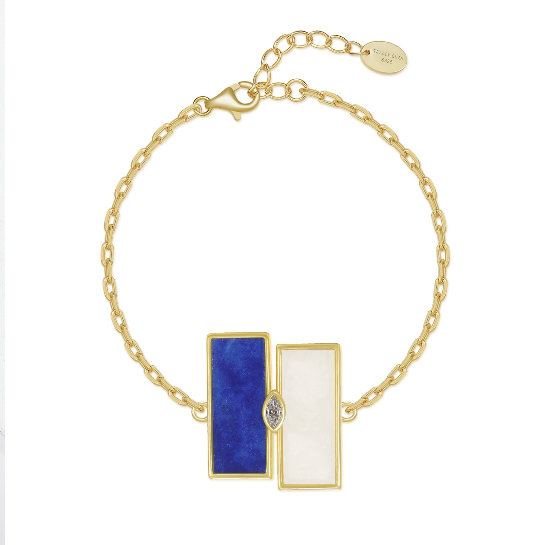天然白翡雙長方未來鑽石手鍊(10分) - 青金石