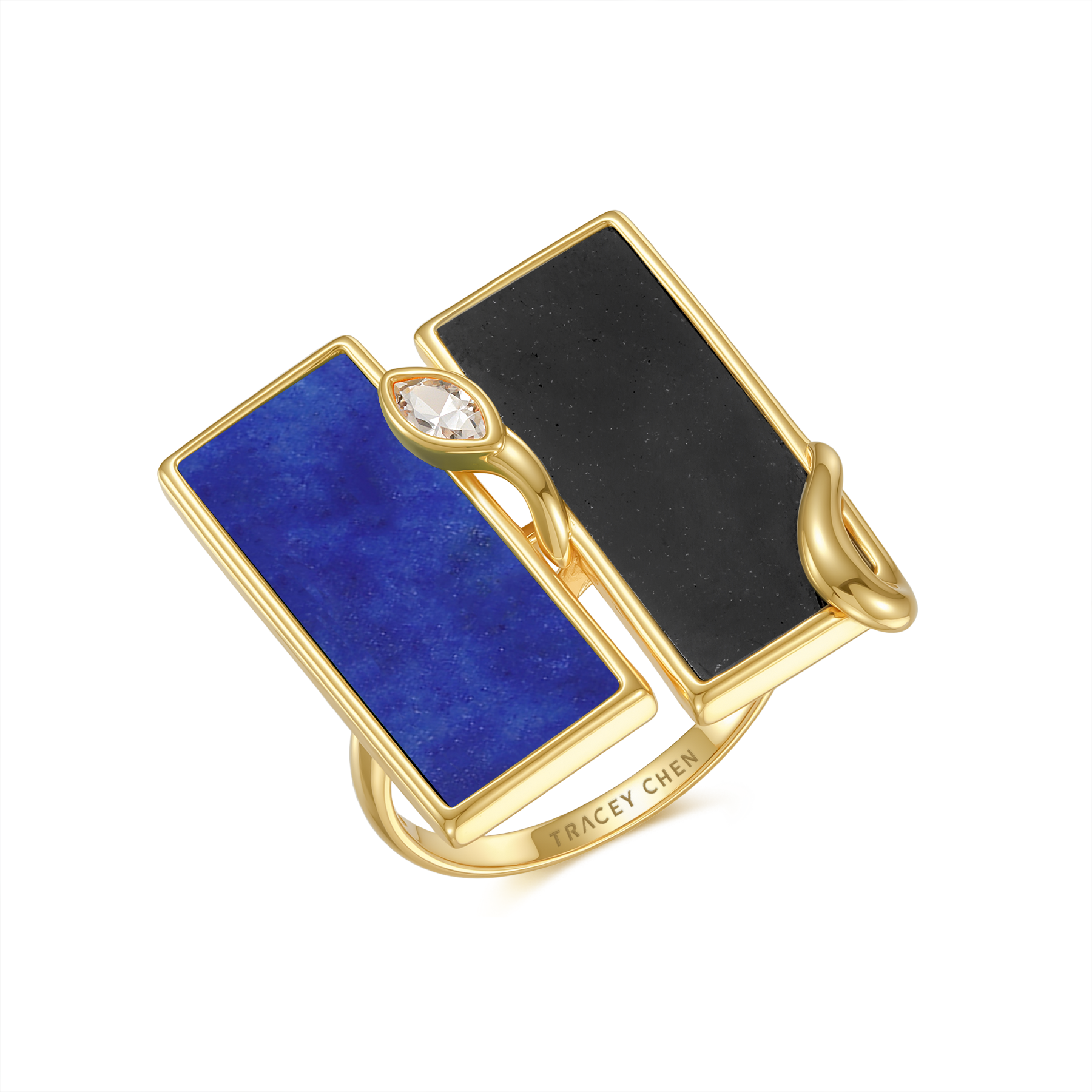 限量款蛇形天然墨翡雙長方未來鑽戒指(10分)-青金石