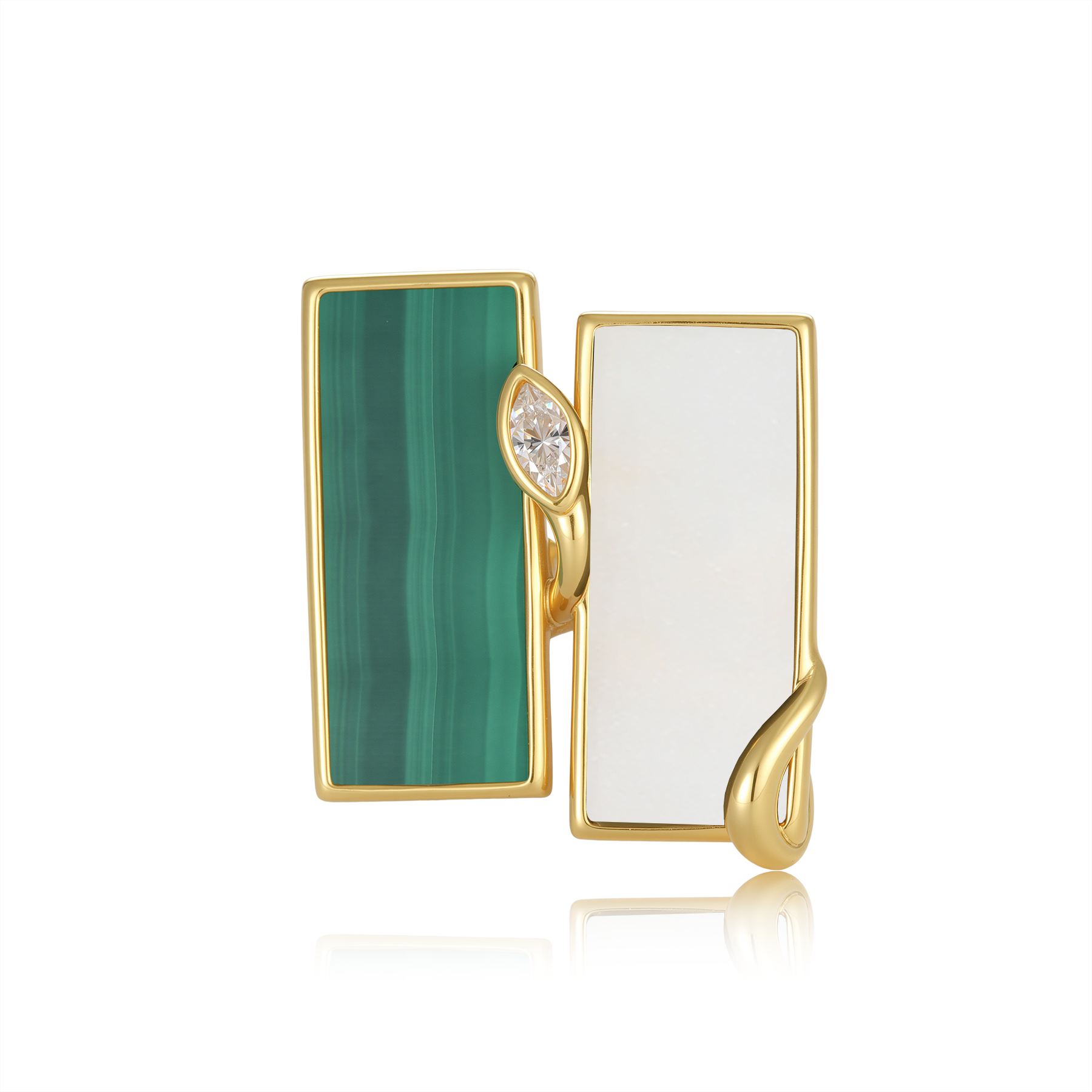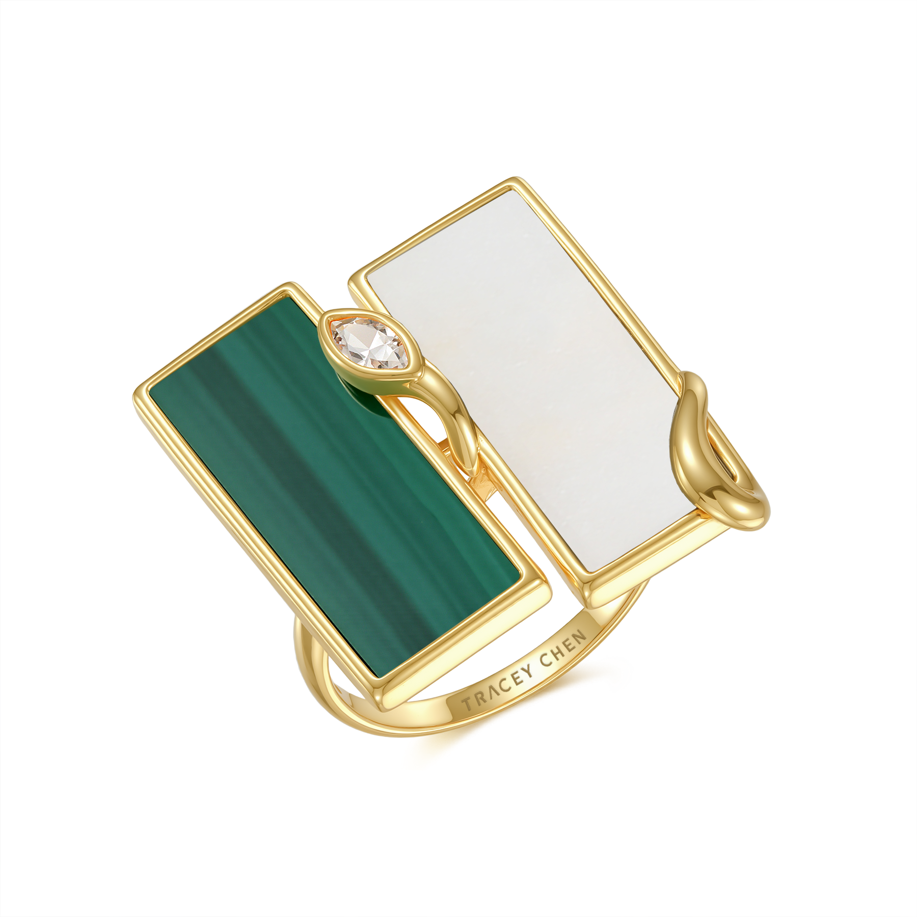 限量款蛇形天然白翡雙長方未來鑽戒指(10分)-孔雀石